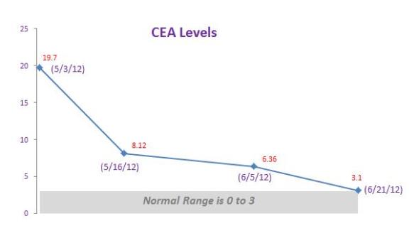 Carcinoembryonic Antigen (CEA) is a substance found in blood that is used to assess whether a colon cancer patient has tumor activity. The normal level for CEA is 0 to 3. High levels of CEA are usually associated with tumor activity (link to more info on CEA). In my case the CEA levels were tested at various points before and after surgeries. The results of these tests are summarized below: