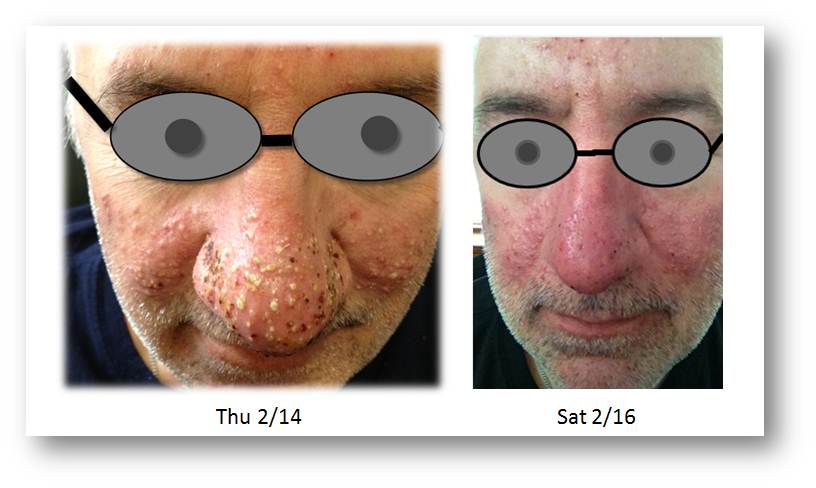 Well, I ended up with the rash. And it was more of an issue than I thought. In fact, the rash was bad enough for the doctor to withhold the Erbitux from today’s treatment. He raised concerns about possible infection and permanent damage to my face (mainly my nose). I asked him if it might make it smaller and he said “yes, the tip might fall off.” And then he reported that I’ll be taking a break from Erbitux so my body can heal a bit. I’m still receiving the FOLFIRI (currently connected to the IV right now).