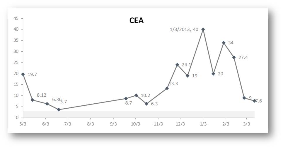 Posted: 03/14/2013 Filed under: Uncategorized 4 CommentsMy CEA is down again (from 9 down to 7.6). This is a hopeful sign that these treatments are working as designed.