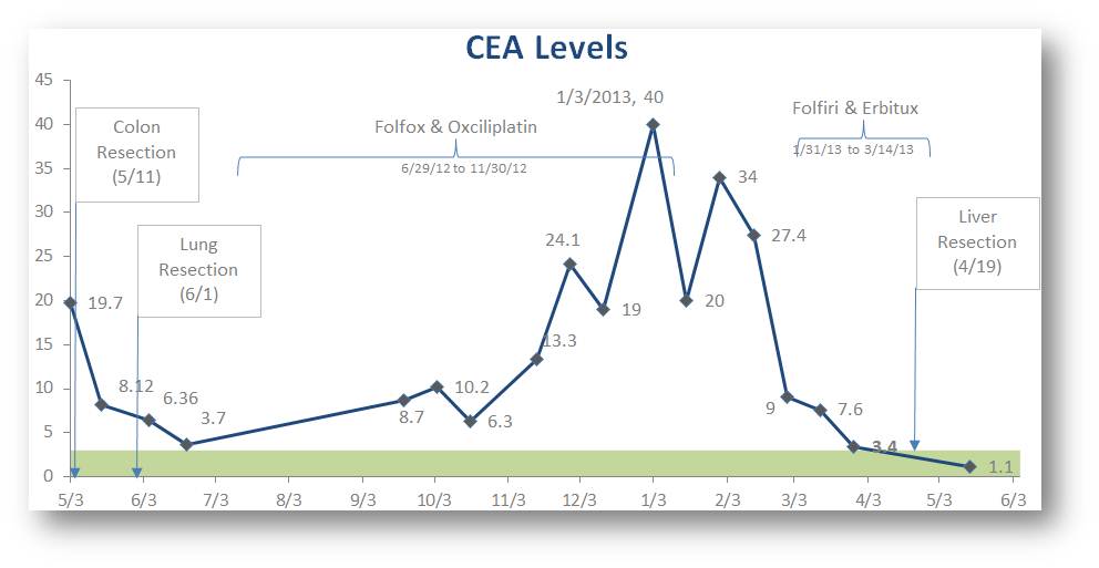 The Oncologist had the best news of all. My CEA level tested as 1.1. This is the very lowest level since starting tests over a year ago. More importantly, the green strip on the bottom of the graphic below represents the normal range for CEA levels. As you can see this is the FIRST TIME my CEA level has fallen within the normal range! Yah!!!