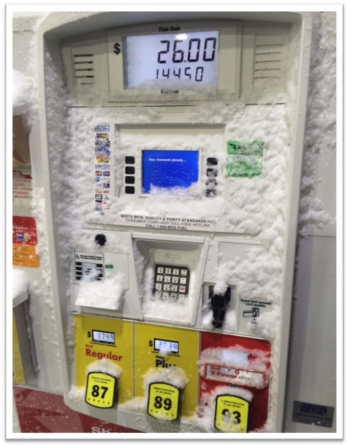 After successfully “taking out the trash” we stopped at the gas station. No way did we want to chance being stranded on the freeway with a half filled fuel tank. And I have to admit; I never saw gas pumps covered in snow like they were. I really wondered if I should turn around while pumping the gas. The ride to Ann Arbor was certainly slow and somewhat stressful; but we arrived safely and on time.